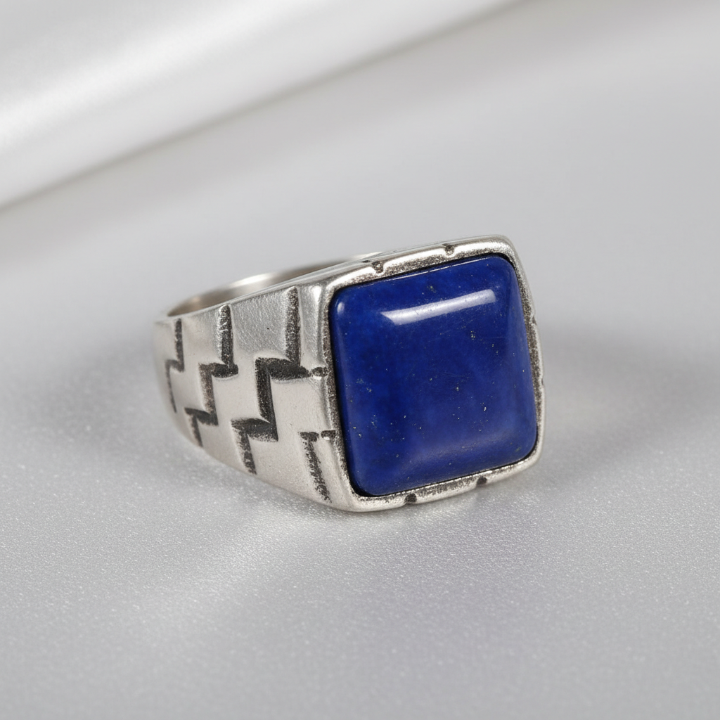 A bold artificial signet ring with hammered texture and clean lines.